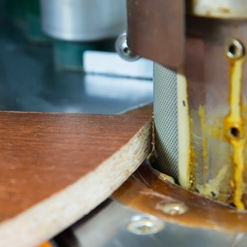 Pneumatyka steruje gilotynami odcinającymi obrzeża ABS/PCV, rolkami dociskowymi oraz stacjami cyklinowania. Wahania ciśnienia w tym miejscu to gwarancja krzywo przyklejonej okleiny.