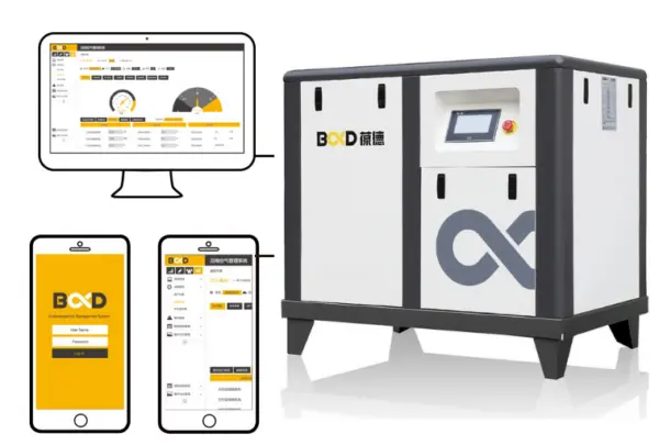 Sterownik umożliwia zmianę wartości minimalnego i maksymalnego ciśnienia, konfigurację harmonogramów pracy oraz kontrolę obciążenia. Dzięki wbudowanemu modułowi łączności możliwe jest także zdalne monitorowanie i zarządzanie kompresorem przez Wi-Fi, co daje szybki dostęp do danych serwisowych i parametrów pracy z dowolnego miejsca.